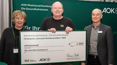 BU: Gemeinsam kochen und gesund essen – der Verein Wir sind Aktiv Hamburg e.V. begeisterte die Förderpreis-Jury mit seiner „Küche für alle“, die gesunde Ernährung auch für den kleinen Geldbeutel erfahrbar macht. Bei der Preisübergabe dabei (v.l.): Erdtrud Mühlens (Gründerin Netzwerk Nachbarschaft), Stefan Bendler (Co-Gründer Wir sind Aktiv Hamburg e.V.) und Thomas Bott, Regionaldirektor der AOK in Hamburg