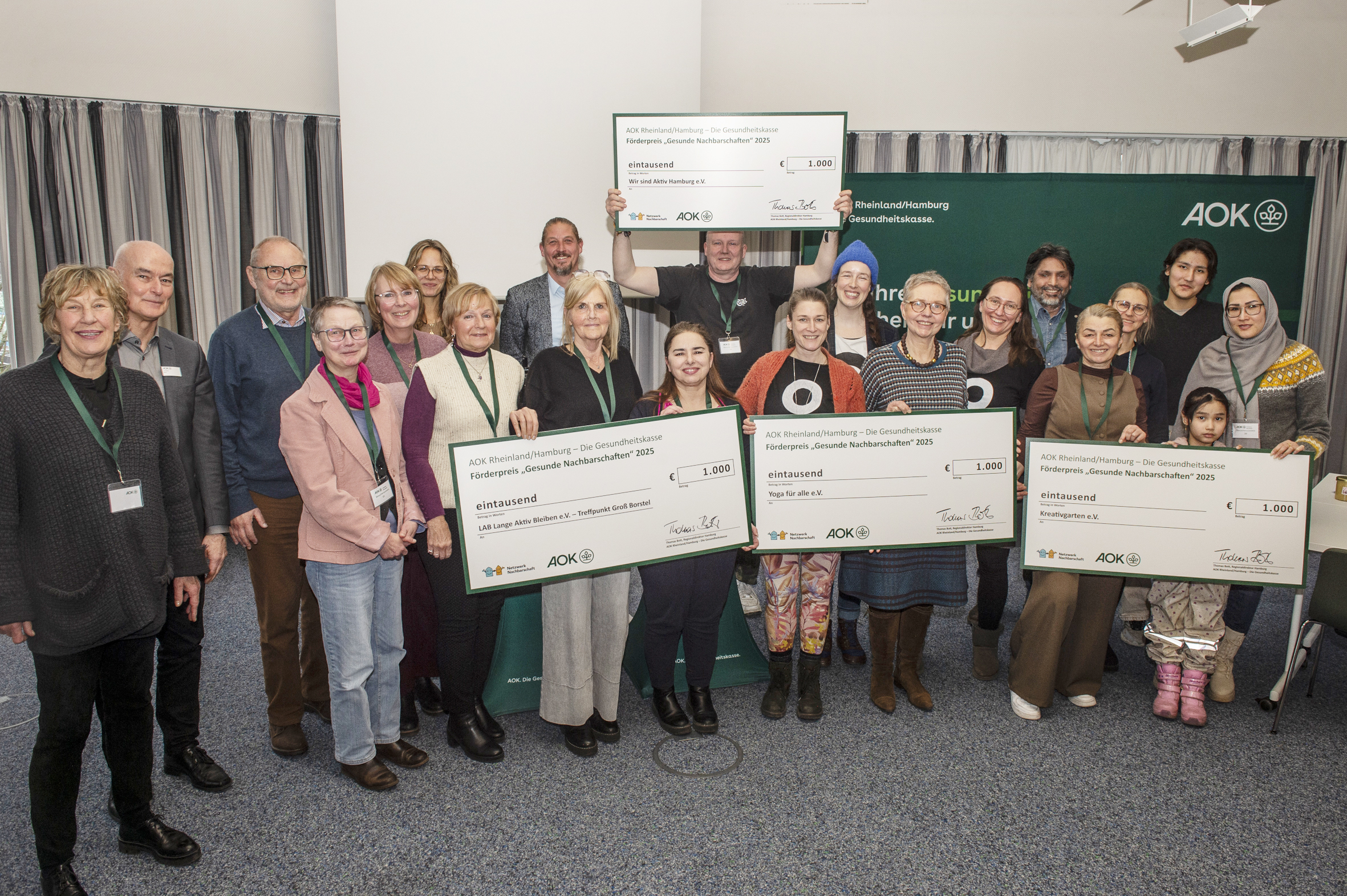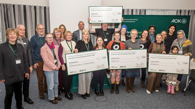 Hamburg, 23. Februar 2026 - Vier Nachbarschaftsgemeinschaften aus der Hansestadt freuen sich über den AOK-Förderpreis „Gesunde Nachbarschaften“. Mit jeweils 1.000 Euro Fördergeld können sie ihre ausgezeichneten Gemeinschaftsprojekte nun weiter ausbauen. Die offizielle Preisübergabe fand in angeregter Runde bei der AOK in Wandsbek statt. Der Regionaldirektor der AOK in Hamburg, Thomas Bott, und Erdtrud Mühlens von Netzwerk Nachbarschaft gratulierten den Preisträgerinnen und Preisträgern.