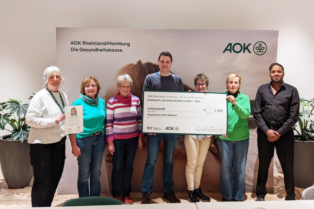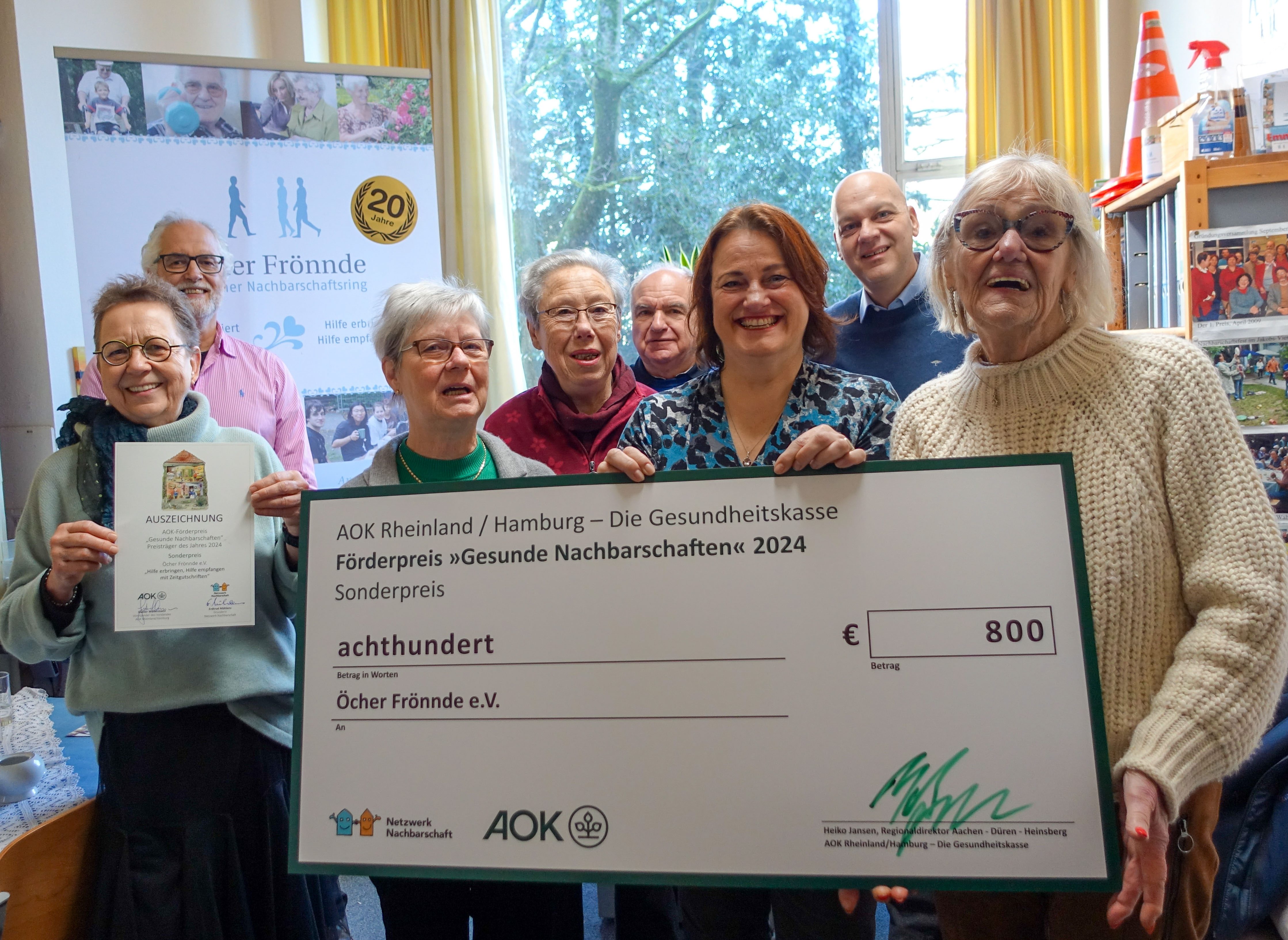 BU: Große Freude bei den „Öcher Frönnden“ über den Sonderpreis „Gesunde Nachbarschaften“ für ihre vorbildliche Zeittauschbörse, überreicht durch AOK Regionaldirektor Heiko Jansen (2.v.r.) In Empfang nahmen Urkunde und Scheck stellvertretend für alle Öcher Frönnde: Monika Lang, Stephan Louis, Joke Knauf, Rita Maria Erken, Wilhelm Knauf, Simone Brütting und Hildegard Kleinsimon.