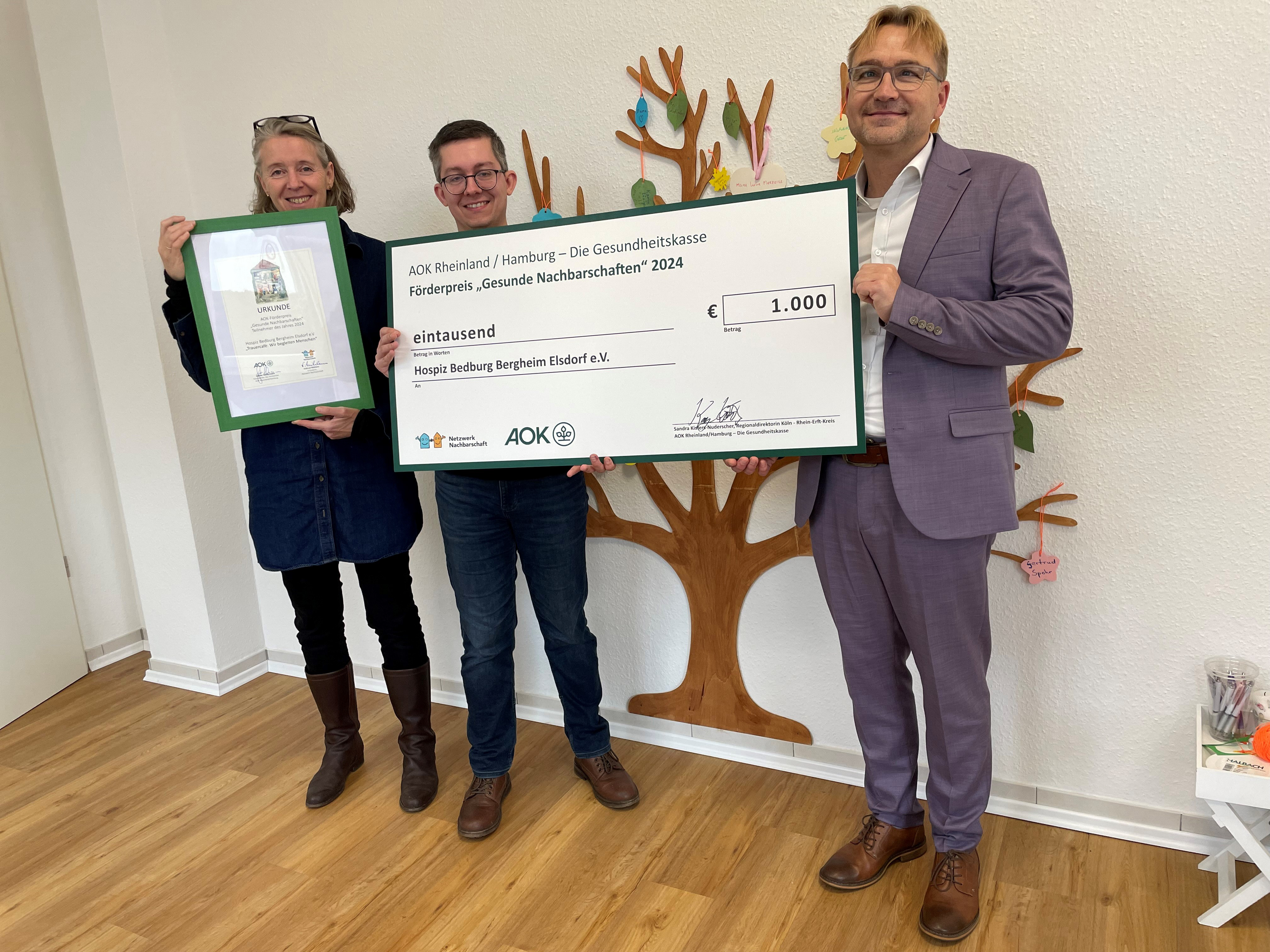 BU: Für die Begleitung junger Trauernde erhält das Hospiz Bedburg Bergheim Elsdorf e.V. den Förderpreis „Gesunde Nachbarschaften“, überreicht von AOK-Geschäftsstellenleiter Kay Woitkowiak an Maria Riederer und Teammitglied Oliver.