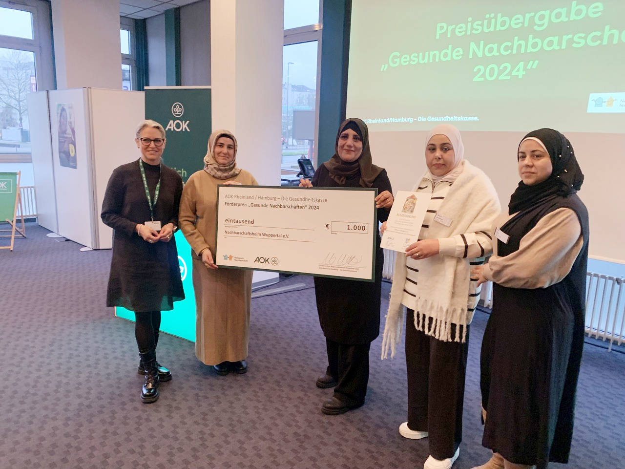 BU: Die Aktiven vom Nachbarschaftsheim Wuppertal e.V. freuen sich über die renommierte Auszeichnung, überreicht von Christiane Otto, Regionaldirektorin AOK Bergisches Land. Sie sind für ihr Projekt „Offener Mittagstisch“ mit dem AOK-Förderpreis „Gesunde Nachbarschaften“ ausgezeichnet worden.