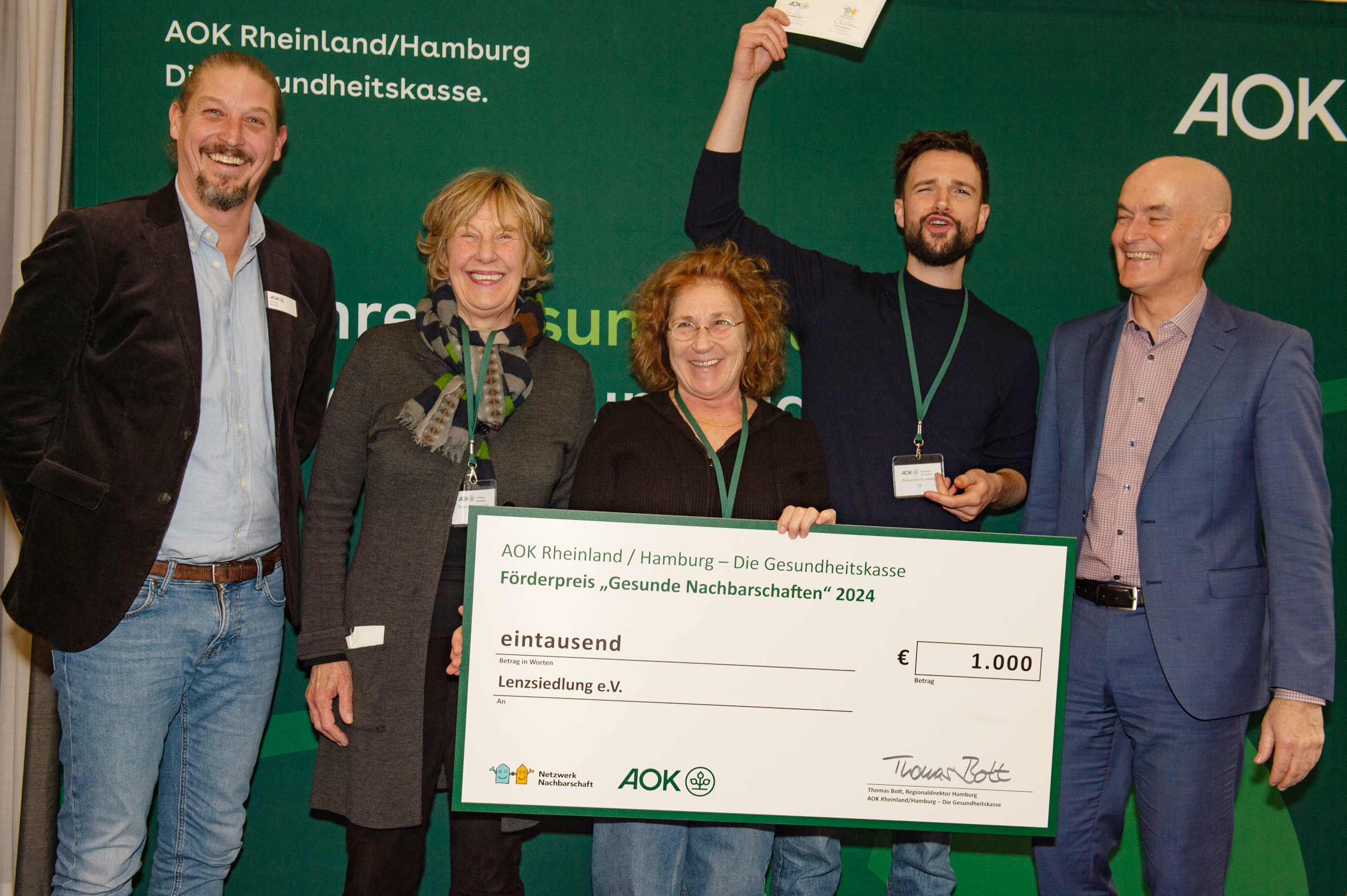 BU: Für ihr Projekt „Fit und bewegt für jedes Alter“ erhalten die Engagierten vom Verein Lenzsiedlung e.V. in Hamburg-Eimsbüttel den Förderpreis „Gesunde Nachbarschaften“. Bei der Preisübergabe dabei: Florian Brandt (AOK Gesundheitsprävention), Erdtrud Mühlens (Gründerin Netzwerk Nachbarschaft), Monika Blaß und Fabian Heinze (beide Lenzsiedlung e.V.) und Thomas Bott, Regionadirektor der AOK Rheinland/Hamburg. (v.l.n.r.)