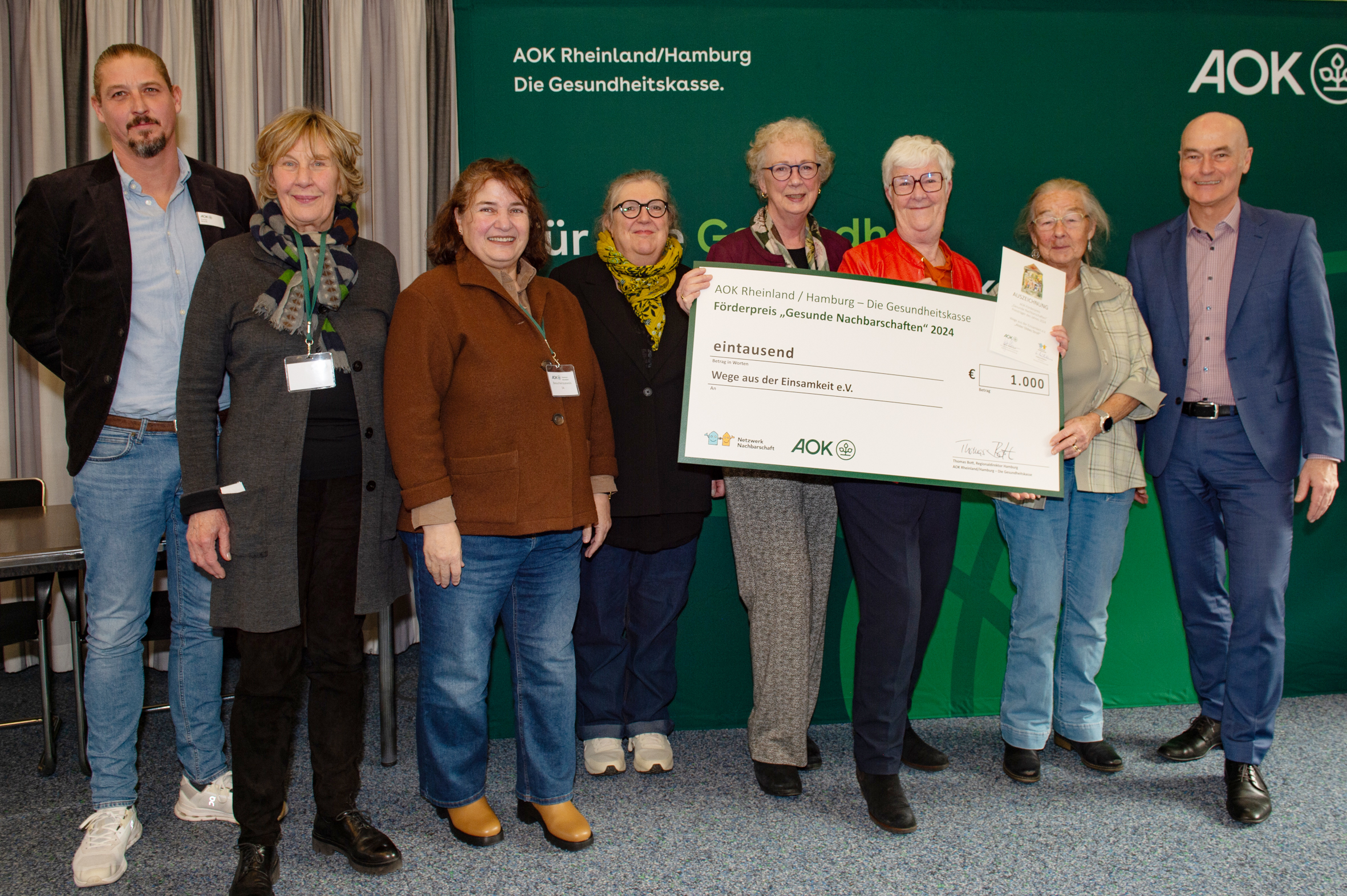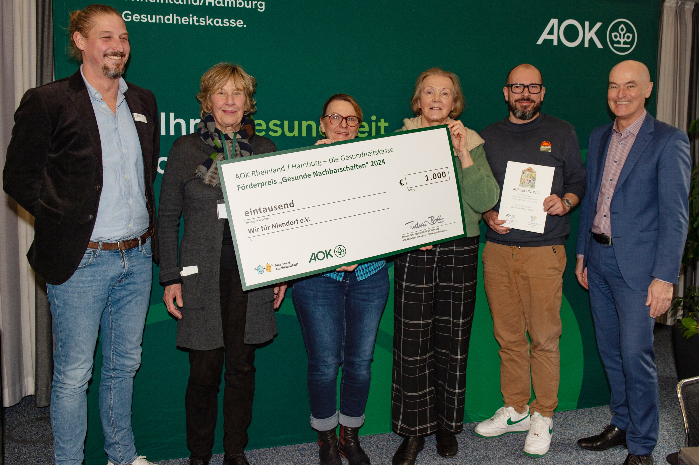 BU: Große Freude über die Auszeichnung „Gesunde Nachbarschaften“ und 1.000 Euro Fördergeld: Thomas Bott, AOK-Regionaldirektor, und Erdtrud Mühlens, Gründerin von Netzwerk Nachbarschaft gratulieren den engagierten Teams von Wege aus der Einsamkeit e.V., Wir für Niendorf e.V., Lenzsiedlung e.V. und dem Quartiersnetzwerk martini.erleben.