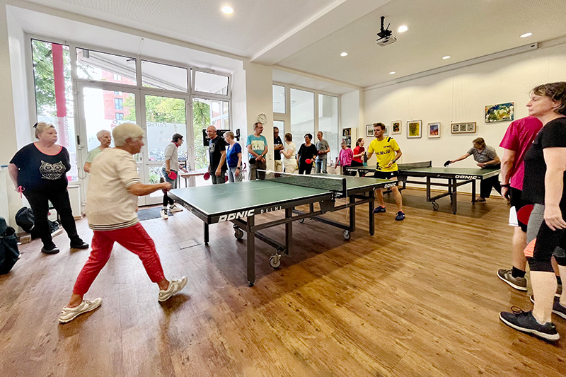 Bewegungsangebote für NachbarInnen ab 50 haben schon lange einen festen Platz im Programm des Nachbarschaftstreffs. Einige davon, etwa „Fit im Park“, finden im nahegelegenen Hammer Park statt. Um auch in der kalten Jahreszeit ein regelmäßiges Sportprogramm anbieten zu können, entwickelten die Engagierten ein weiteres Angebot, das auch in Innenräumen gut funktioniert und die Bedürfnisse von jungen und älteren Anwohnenden nach Bewegung im Winter aufgreift: Tischtennis! Gemeinsam Spaß zu haben und spielerisch fit zu bleiben, das kommt gut an bei den NachbarInnen. Denn das regelmäßige Tischtennisspiel stärkt nicht nur ihre Beweglichkeit, Balance und Herz-Kreislauf-Gesundheit, sondern schult auch die Hand-Augen-Koordination.