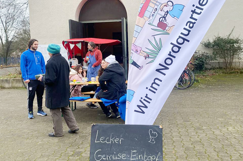 Köln Mülheim-Nord gilt als sogenannter Stadtteil mit besonderem Entwicklungsbedarf. Ein Grund mehr, unbürokratische Lösungsansätze zu finden, dachten sich die freiwillig engagierten NachbarInnen von „Wir im Nordquartier“ und rollen mit ihrer mobilen Küche „Wie geht’s?“ durchs Viertel. Im Angebot: ein gesunder Mittagstisch gegen Spende – und ein offenes Ohr für Smalltalk unter NachbarInnen. So stärken sie nicht nur das Bewusstsein für frische, vorwiegend vegetarische Ernährung, sondern im Gespräch über Sorgen und Nöte auch die Resilienz der Anwohnenden. In den Wintermonaten pausiert die Outdoor-Küche, dafür organisieren die Aktiven Mitmach-Events mit dem im Veedel bekannten Koch Waskhar. Die Teilnehmenden erlernen hier die Zubereitung der gesunden Gerichte, die sie bereits vom mobilen Mittagstisch kennen.