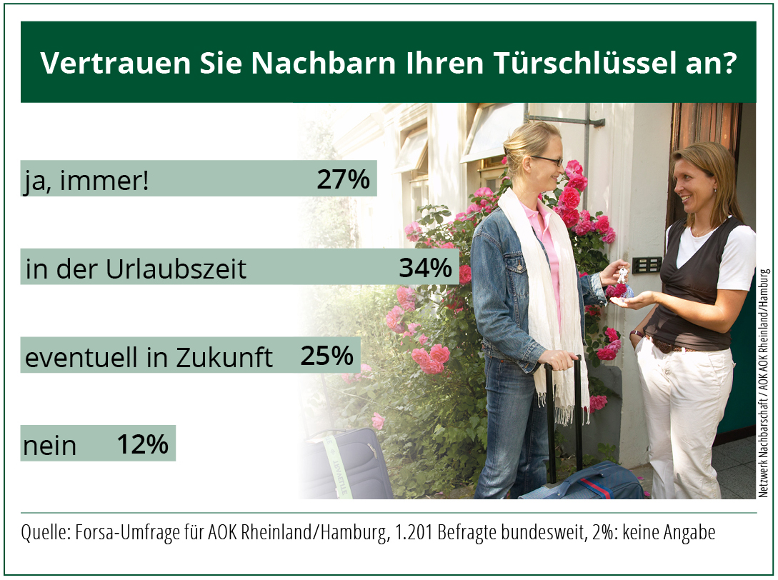 Hamburg/Düsseldorf, 20.04.22 – Nachbarn in Deutschland zeigen sich überraschend aufgeschlossen: Eine große Mehrheit spricht sich für den Schlüsseltausch aus, viele vertrauen ihren Haus- oder Wohnungsschlüssel bereits einem Nachbarn an. Das ergibt eine aktuelle Forsa-Umfrage im Auftrag der AOK Rheinland/Hamburg. Die Gesundheitskasse und Netzwerk Nachbarschaft fördern Nachbarinitiativen, die sich für ein gesundes Miteinander engagieren.