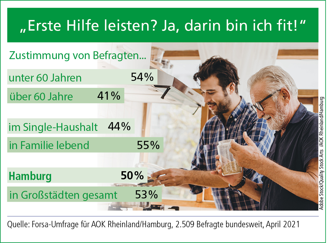 Viele Unfälle passieren im Haushalt, mit dem Alter steigt diese Gefahr deutlich an. Ersthelfende sind oft die Nachbarn. Doch jeder Zweite in Hamburg traut es sich nicht zu, im Notfall angemessen helfen zu können. Das ergibt eine repräsentative Forsa-Umfrage im Auftrag der AOK Rheinland/Hamburg. Die Gesundheitskasse fördert jetzt zusammen mit Netzwerk Nachbarschaft Aktionen für ein gesundes Wohnumfeld.