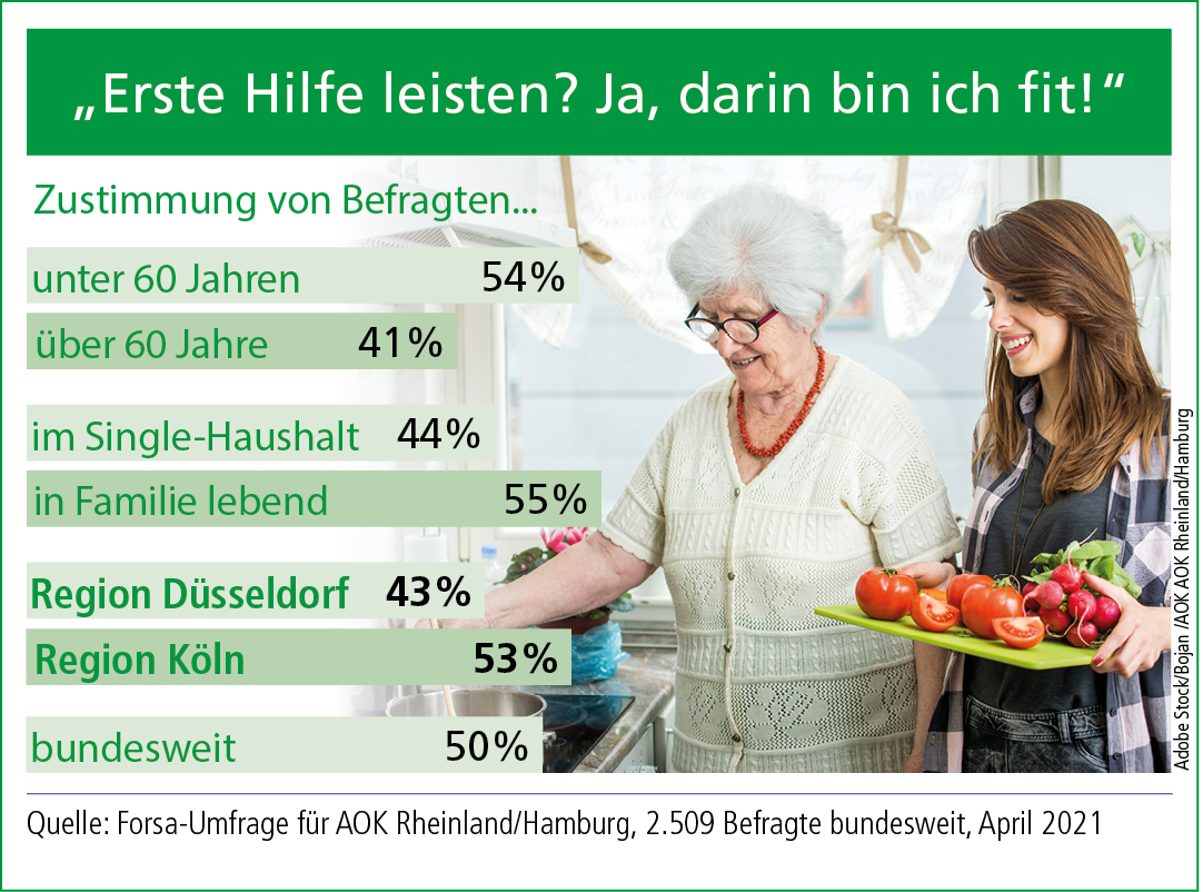 Viele Unfälle passieren im Haushalt und Ersthelfende sind oft Menschen aus dem nahen Umfeld. Doch mindestens jeder Zweite im Rheinland traut es sich nicht zu, im Notfall angemessen helfen zu können. Das ergibt eine repräsentative Forsa-Umfrage im Auftrag der AOK Rheinland/Hamburg. Die Gesundheitskasse fördert jetzt zusammen mit Netzwerk Nachbarschaft Aktionen für ein gesundes Wohnumfeld.