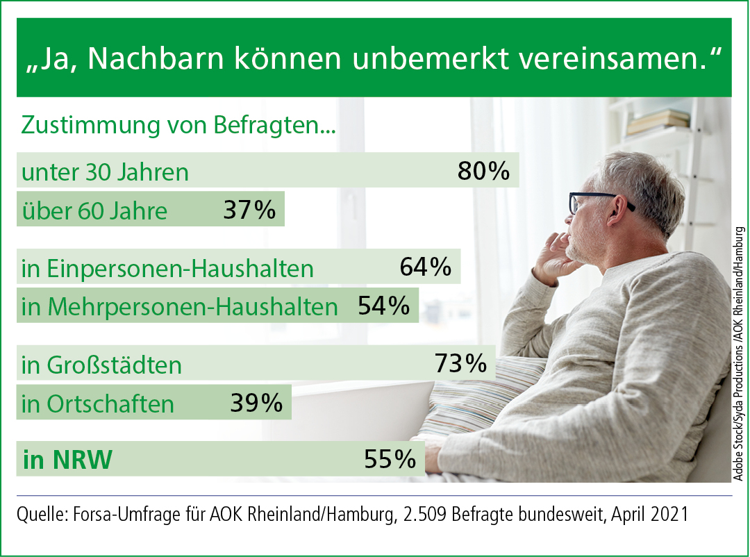 Soziale Isolation macht krank, und sie nimmt zu. Eine Mehrheit der Deutschen hält es für möglich, dass Menschen in ihrer Nachbarschaft unbemerkt vereinsamen. Im Rheinland geben dies 58 Prozent an. Das zeigt eine repräsentative Forsa-Umfrage im Auftrag der AOK Rheinland/Hamburg. Um das gesunde Miteinander auch in Corona-Zeiten zu stärken, fördern die Gesundheitskasse und das Netzwerk Nachbarschaft jetzt innovative Selbsthilfeprojekte.