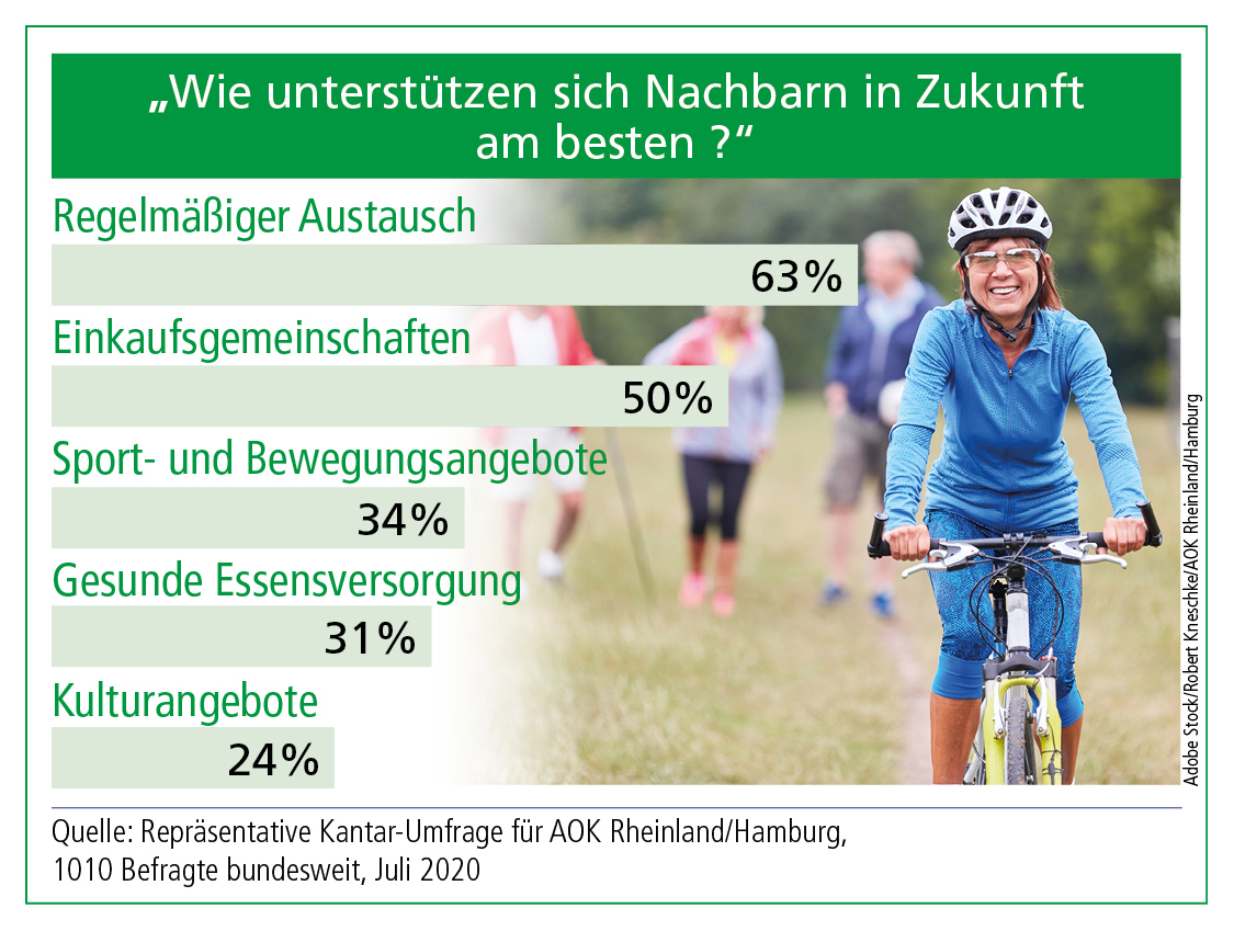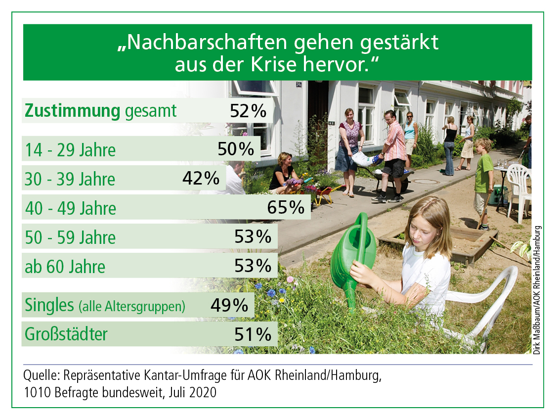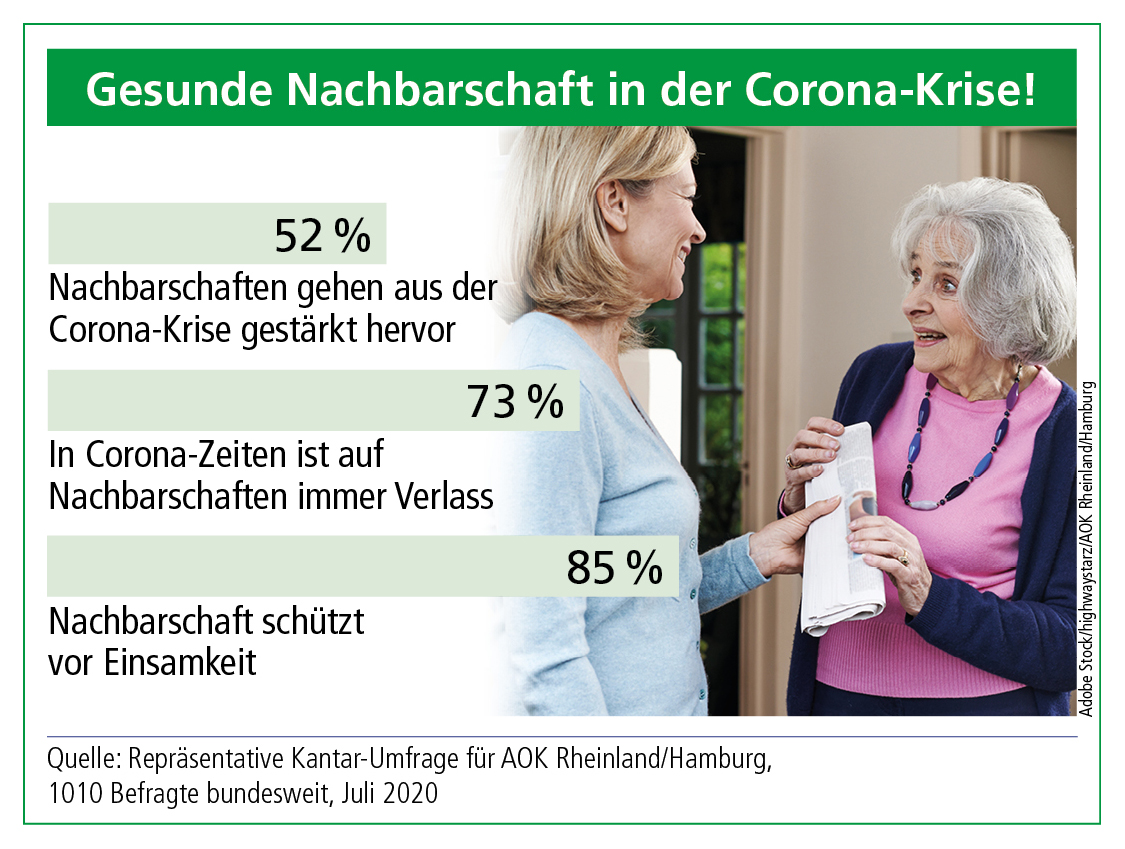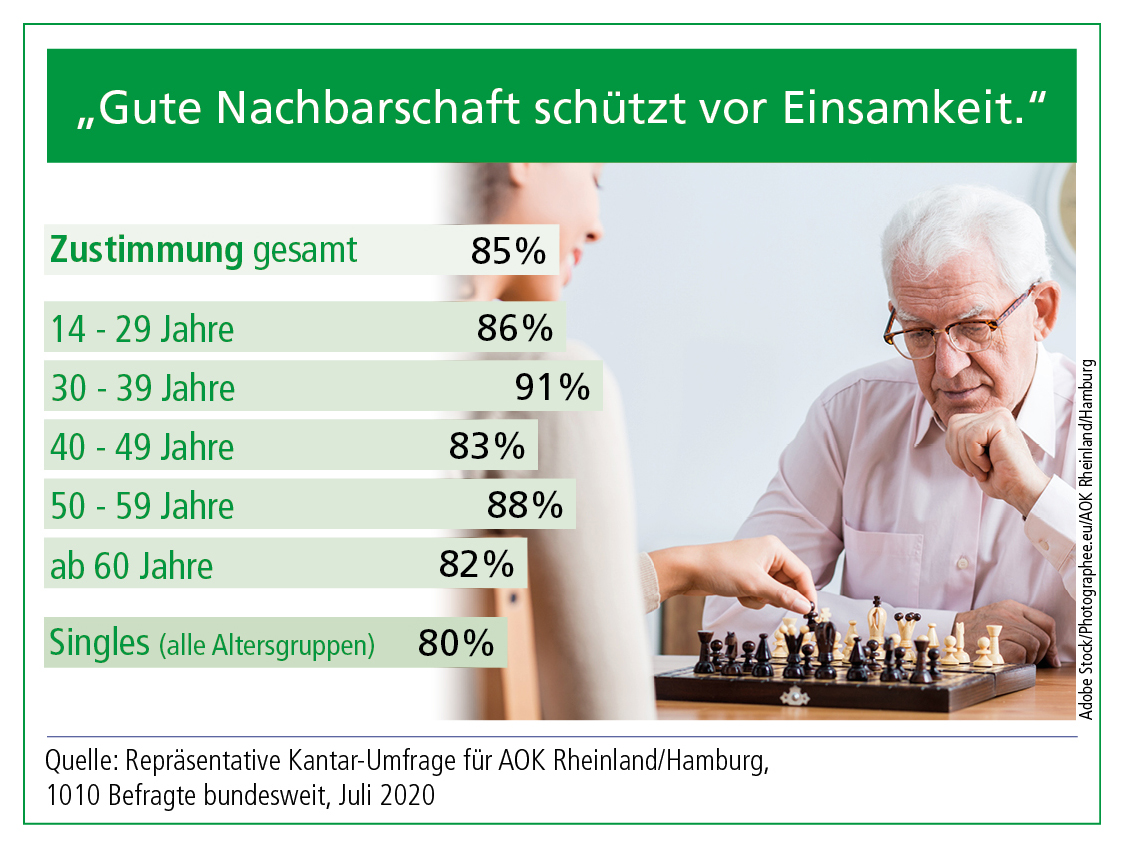 Düsseldorf/Hamburg, August 2020 - Nach einer repräsentativen Umfrage der AOK Rheinland/Hamburg sind 85 Prozent der Menschen überzeugt, dass eine gute Nachbarschaft vor Einsamkeit schützt. Vor allem Jüngere schätzen den direkten Draht nach nebenan. Die AOK Rheinland/Hamburg zeichnet beispielhafte Nachbarschaftsprojekte aus.